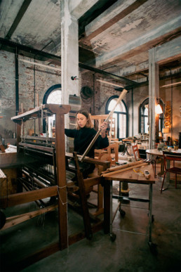 Dans les Zaventem Ateliers, du haut de ses 31 ans, Adeline Halot, designer textile, y tisse son jeu unique de matières. Entre ses mains, ses tissages artisanaux deviennent, des tapisseries, des sculptures, du mobilier mais surtout des œuvres d’art à part entière prenant une dimension architecturale.