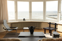 En panorama extérieur, les vagues de la mer du Nord qui s’étendent à perte de vue et pénètrent par les vastes baies vitrées, dont elles semblent effacer les contours. Pour décor intérieur, les 97 m2 d’un appartement hybride, à mi-chemin de la destination vacances et du lieu d’exposition, où les étagères et les murs accueillent des œuvres uniques. Et dont les sièges, les tapis ou encore les vases sont des créations artisanales. Derrière chaque objet, un artiste émergent ou un designer confirmé de la scène belge comme internationale, dont le travail a quitté les galeries et les ateliers pour se mêler au quotidien. Et au plaisir de moments en famille ou entre amis, au bord des plages ostendaises.