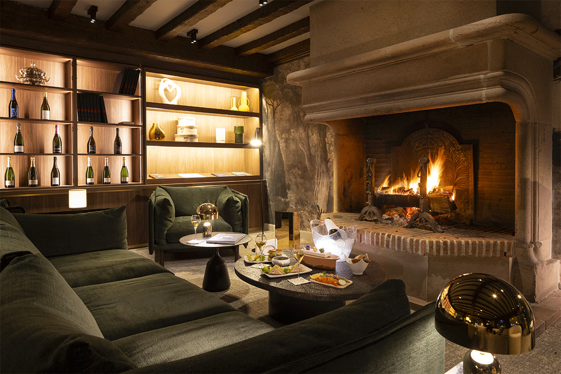 Avant de passer à table, halte au bar lounge. Fauteuils profonds, lumière tamisée, cheminée en pierre, bouteilles alignées comme une promesse. Face au feu, nous dégustons une coupe de cham- pagne Bouché, Cuvée Réservée Brut, dans une atmosphère feutrée, propice à la déconnexion.