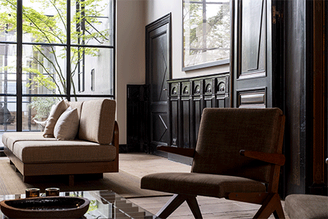 Leur intervention a consisté à réinventer sans bouleverser. Pas question de toucher à la circulation originelle, mais de renforcer l’atmosphère avec des matériaux massifs et patinés, du mobilier sur mesure et une mise en lumière pensée avec PS Lab. Dans le salon, le bar ou la salle du petit-déjeuner désormais servis à la carte, tout respire la sophistication sans ostentation.