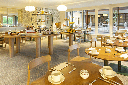 Le restaurant gastronomique « Alcôve » nous accueille dans un écrin de lumière. Par un large bow-window, la vue se prolonge vers le parc, ses haies taillées et sa fontaine. Tables nappées de blanc, assises vert mousse, luminaires en laiton : un décor feutré et contemporain, pensé pour laisser la nature entrer avec discrétion.