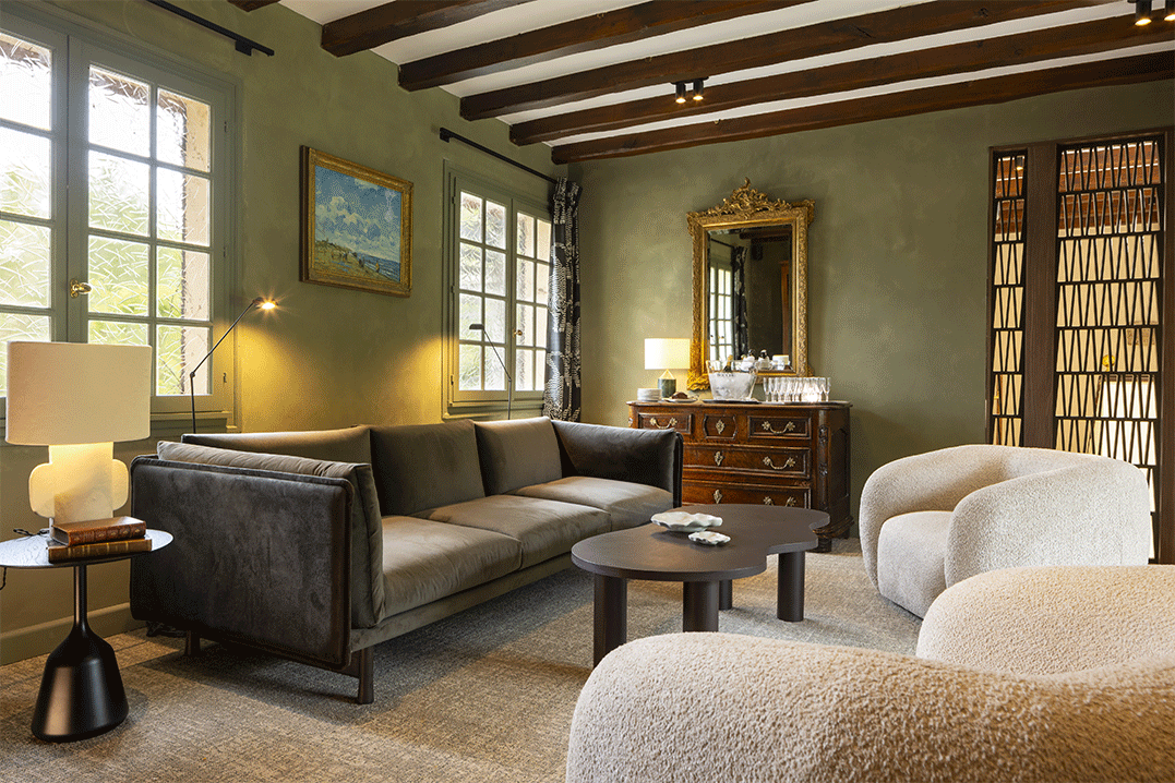 Les quarante chambres et suites ont été repensées par l’architecte Marie Courdouan. La nôtre séduit d’emblée par ses dimensions généreuses, sa vue sur la nature environnante et ses tonalités apaisantes. Aux blancs lumineux s’ajoutent un gris taupe cendré et un kaki profond, qui structurent l’espace avec douceur. Dans la salle de bain, le terrazzo habille le sol et les murs assurant une belle continuité graphique.