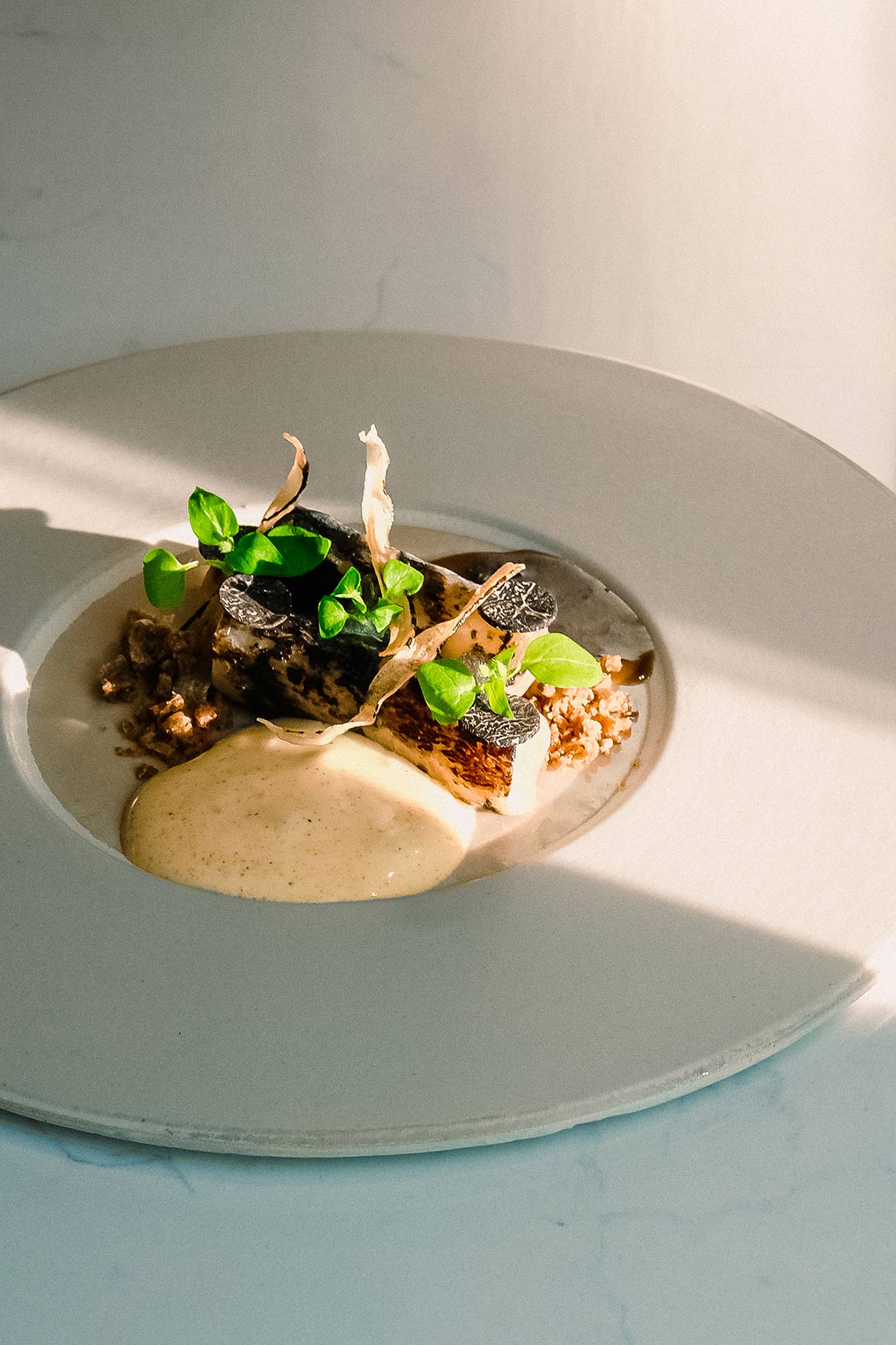 Du jus de bouillabaisse pour accompagner le rouget gravlax au travail de l’agneau, avec des odeurs saisissantes qui s’en dégagent, en passant par le soin réservé aux légumes, il devient difficile de désigner un plat favori. La puissance gustative de l’association salsifis-truffe nous emporte toutefois dans un tout autre monde. Le chef réussit une prouesse dans l’utilisation de ce produit noble qui s’accompagne d’une mousseline de beurre noisette pour l’onctuosité ou encore d’un gel de verjus pour la fraîcheur et le peps.