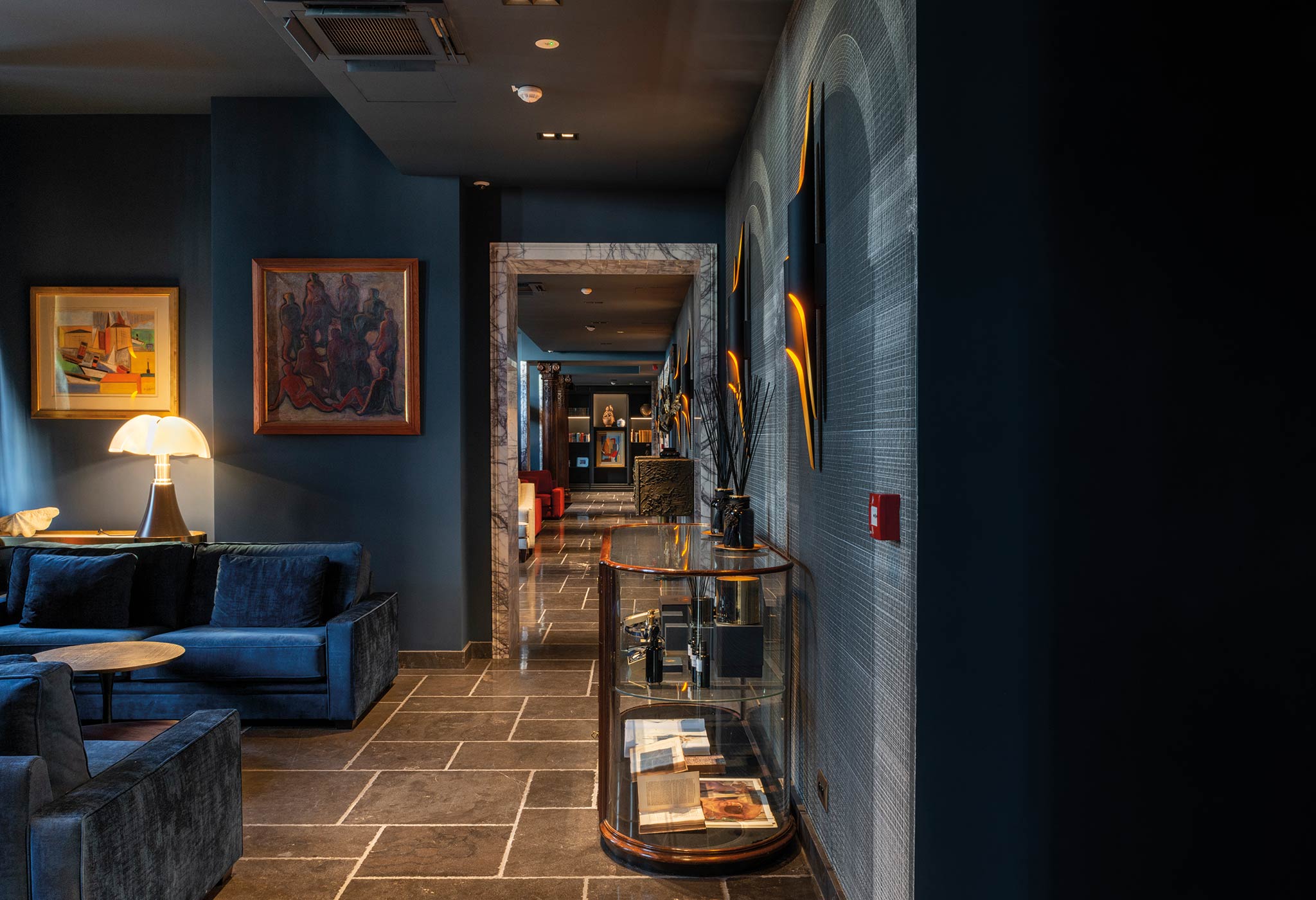 Car sans flagornerie aucune adressée à Eric Cleton, il faut bien avouer que son Juliana ne ressemble à aucune autre belle demeure. Ni même au Juliana cannois ou parisien. La déco néo-classique (inspirée de la façade classée du bâtiment) réveillée de notes contemporaines raffinées, en fait une véritable demeure d’exception. Une adresse singulière, jusqu’au moindre papier peint exclusif. Chaque espace est notamment paré de sculptures, tableaux ou ornements uniques, de la collection privée du propriétaire. La tendance classique du siècle dernier se révélant sous de fines inspirations Hermès, Michel-Ange, Versace, Le Corbusier, Starck. Ainsi, l’escalier menant aux étages mérite à lui seul une pose pour admirer une mosaïque rare sur un thème de Michel-Ange et Cléopâtre et une rampe en fer forgé années 30 inspirée de Tony Duquette. Au sous-sol, un centre de bien-être avec piscine : marbre Médusa oversize, décor de fresques murales en mosaïque encore inspirées cette fois par Le Corbusier, et de pâte de verre de Murano pour habiller l’espace …
