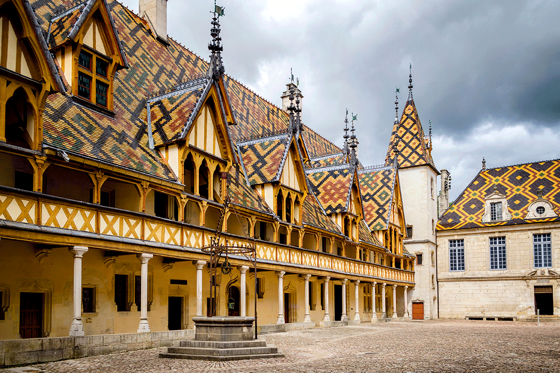 Depuis l’Hostellerie, il ne nous faut que quelques minutes de marche pour rejoindre le centre historique de Beaune, ville médiévale ceinte de remparts. Incontournable, l’Hôtel-Dieu des Hospices s’impose comme l’un des bâtiments les plus emblématiques de la région. Avec ses toits en mosaïque de tuiles vernissées, il figure parmi les joyaux de l’architecture gothique bourguignonne. C’est aussi un domaine viticole de renom : chaque année, le troisième dimanche de novembre, s’y tient la plus célèbre vente de charité vinicole du monde.