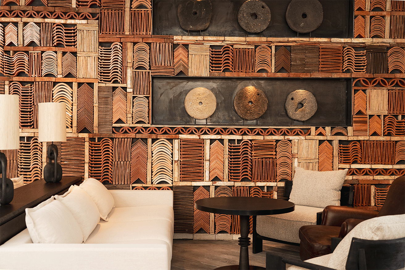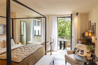 La signature de l’architecte et décorateur Jean-Philippe Nuel se devine dans l’attention aux matières : bois, pierre, métal patiné, ferronneries délicates, tuiles au teint de soleil. Les matières naturelles sont sur le devant de la scène. Plus de 120 pièces d’art jalonnent également le lieu, à commencer par « L’Âme de la Provence », la majestueuse fresque monumentale de huit mètres, façonnée de tuiles locales et située dans le hall central. Incroyable ! Les meubles ont été chinés auprès des antiquaires de la ville et dialoguent en toute harmonie avec les créations contemporaines. Quant aux chambres, elles se dévoilent comme des refuges de douceur où chaque recoin a une histoire à toucher du regard. Trois éléments chers à Patrick Bruel s’y retrouvent indéniablement : des livres, un olivier et l’historique roue de L’Isle-sur-la-Sorgue. Partout, l’artisanat provençal signe un luxe discret, sensible. Avec L’Isle de Leos, le chanteur et comédien français rend à la Provence tout ce qu’elle lui a offert…