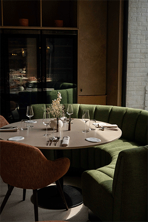 Fini l’urbain, place à la campagne. Après une année de travaux intenses, Le « Maloma » schaerbeekois renaît sous la forme de Màloma, niché dans l’aile d’une ferme en carré au bout d’un chemin en terre où se dresse le domaine Foster. Ici, au cœur du Brabant wallon, les 30 hectares de prés et de champs composent le décor quotidien. C’est un paysage qui respire, nourrit et inspire. La salle occupe une grange majestueuse : charpente apparente, murs couleur terre et grand comptoir central vert pour ouvrir la perspective sur la cuisine. Quelques luminaires tels des planètes suspendues et un mobilier aux lignes épurées terminent ce tableau chaleureux, en juste résonance avec l’environnement. Tour à tour, tons terracotta et vert et formes arrondies rappellent constamment mère nature. Une élégance apaisante et organique, en parfait écho avec la philosophie du restaurant. Le décor est dressé, place à l’assiette.